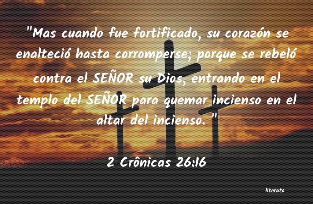 "Mas cuando fue fortificado, su corazón se enalteció hasta corromperse; porque se rebeló contra el SEÑOR su Dios, entrando en el templo del SEÑOR para quemar incienso en el altar del incienso. "