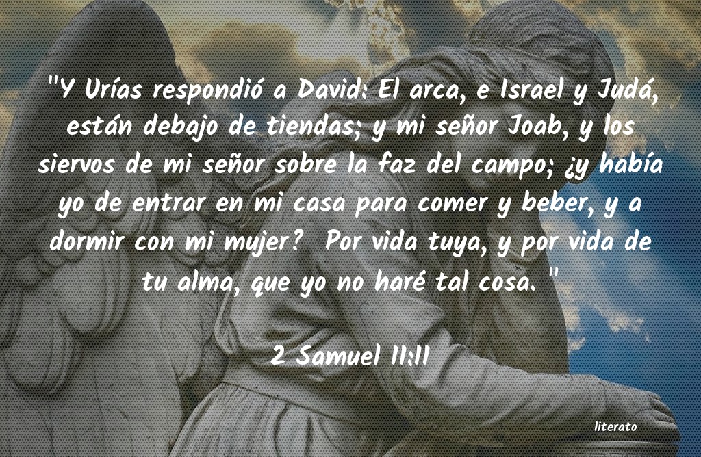 "Y UrÃas respondió a David: El arca, e Israel y Judá, están debajo de tiendas; y mi señor Joab, y los siervos de mi señor sobre la faz del campo; ¿y habÃa yo de entrar en mi casa para comer y beber, y a dormir con mi mujer? Por vida tuya, y por vida de tu alma, que yo no haré tal cosa. "