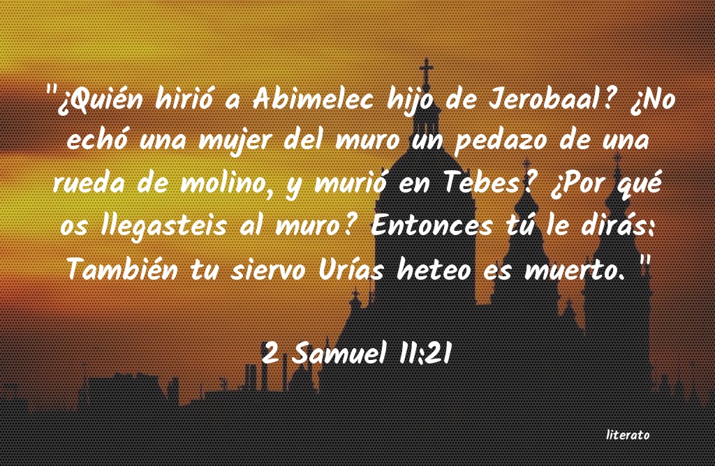 "¿Quién hirió a Abimelec hijo de Jerobaal? ¿No echó una mujer del muro un pedazo de una rueda de molino, y murió en Tebes? ¿Por qué os llegasteis al muro? Entonces tú le dirás: También tu siervo UrÃas heteo es muerto. "