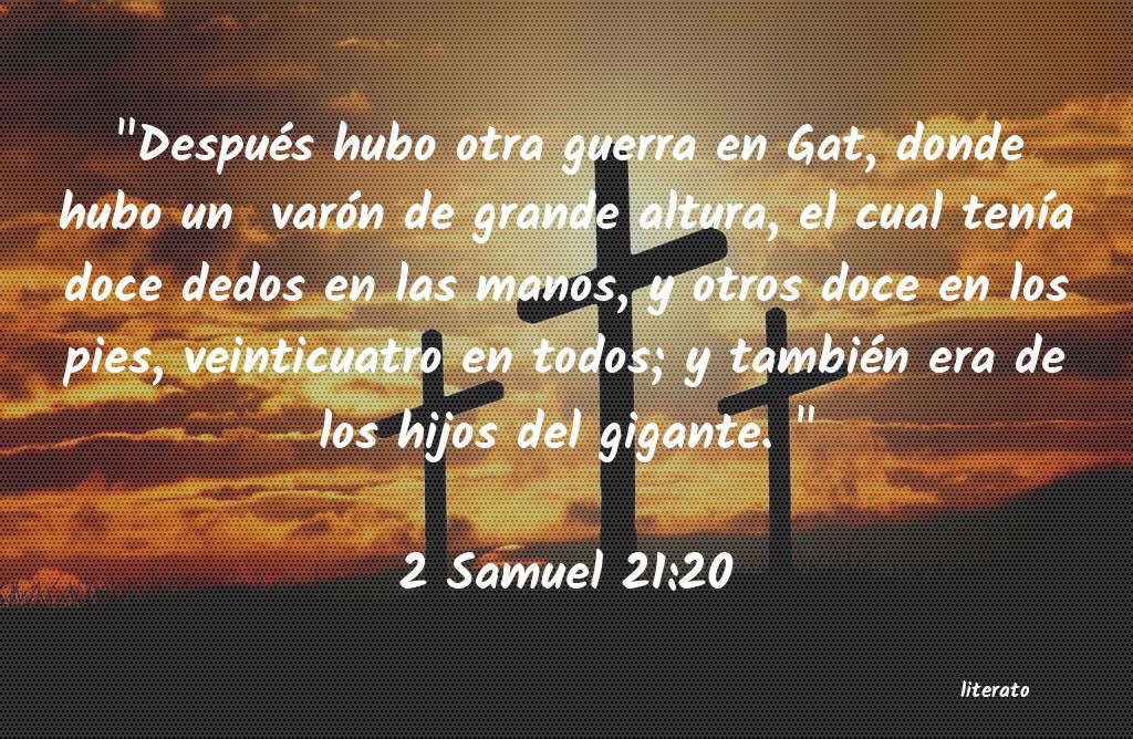"Después hubo otra guerra en Gat, donde hubo un varón de grande altura, el cual tenÃa doce dedos en las manos, y otros doce en los pies, veinticuatro en todos; y también era de los hijos del gigante. "