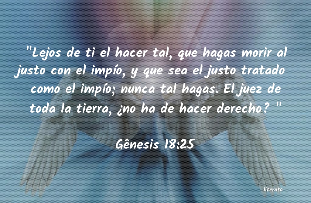 "Lejos de ti el hacer tal, que hagas morir al justo con el impÃo, y que sea el justo tratado como el impÃo; nunca tal hagas. El juez de toda la tierra, ¿no ha de hacer derecho? " Gênesis 18:25