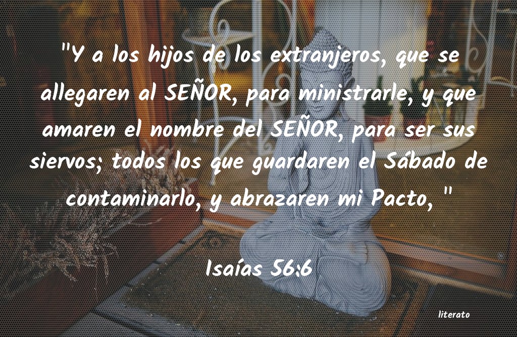 "Y a los hijos de los extranjeros, que se allegaren al SEÑOR, para ministrarle, y que amaren el nombre del SEÑOR, para ser sus siervos; todos los que guardaren el Sábado de contaminarlo, y abrazaren mi Pacto, "