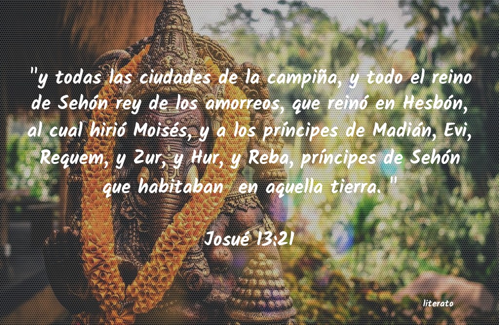 "y todas las ciudades de la campiña, y todo el reino de Sehón rey de los amorreos, que reinó en Hesbón, al cual hirió Moisés, y a los prÃÂncipes de Madián, Evi, Requem, y Zur, y Hur, y Reba, prÃÂncipes de Sehón que habitaban en aquella tierra. "