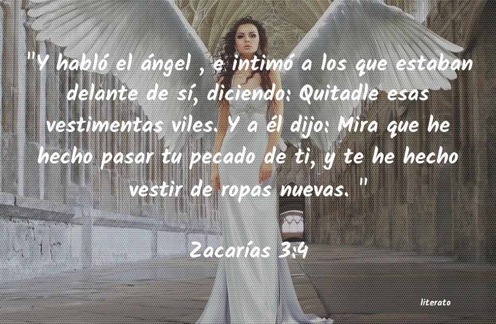 "Y habló el ángel , e intimó a los que estaban delante de sÃÂ, diciendo: Quitadle esas vestimentas viles. Y a él dijo: Mira que he hecho pasar tu pecado de ti, y te he hecho vestir de ropas nuevas. "