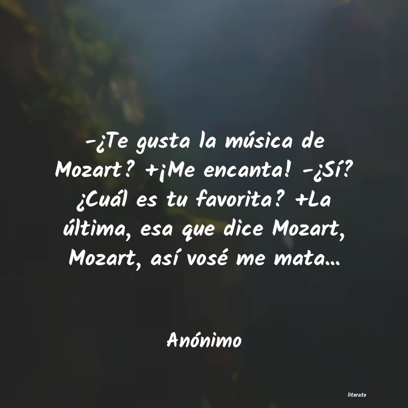 -¿Te gusta la música de Mozart? +¡Me encanta! -¿Sí? ¿Cuál es tu favorita? +La última, esa que dice Mozart, Mozart, así vosé me mata...