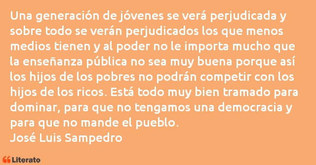 Una generación de jóvenes se verá perjudicada y sobre todo se verán perjudicados los que menos medios tienen y al poder no le importa mucho que la enseñanza pública no sea muy buena porque así los hijos de los pobres no podrán competir con los hijos de los ricos. Está todo muy bien tramado para dominar, para que no tengamos una democracia y para que no mande el pueblo.