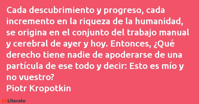 Cada descubrimiento y progreso, cada incremento en la riqueza de la humanidad, se origina en el conjunto del trabajo manual y cerebral de ayer y hoy. Entonces, ¿Qué derecho tiene nadie de apoderarse de una partícula de ese todo y decir: Esto es mío y no vuestro?