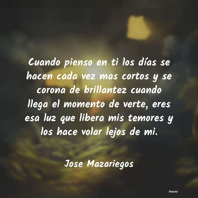 Cuando pienso en ti los días se hacen cada vez mas cortos y se corona de brillantez cuando llega el momento de verte, eres esa luz que libera mis temores y los hace volar lejos de mi.
